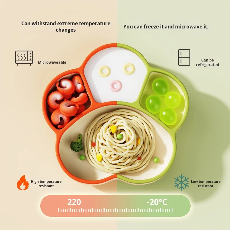 सिलिकॉन विभाजित बेबी डिनर प्लेट जिसमें सक्शन कप लगा है और बच्चों के लंच बॉक्स के लिए उपयुक्त
