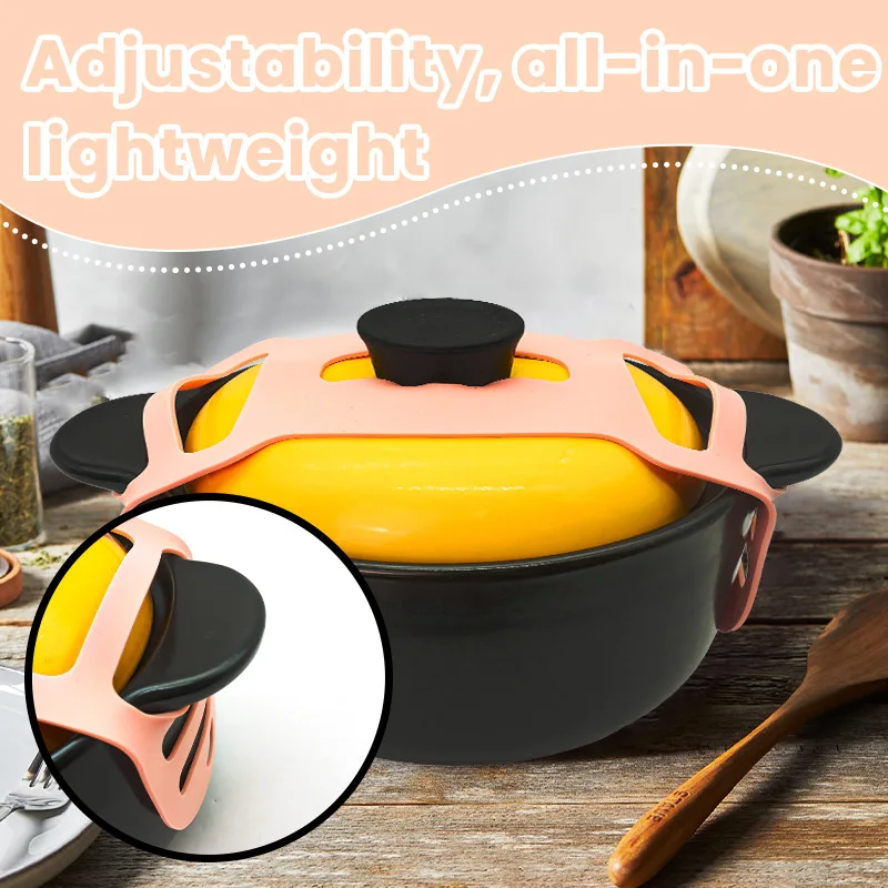 Adjustable integrated lightweight silicone pot lid strap | Anti-slip and leak-proof design, suitable for various sizes of cookware and lunch boxes. The silicone material is durable and sturdy, and is a must-have accessory for preventing spills and dropping in the kitchen.